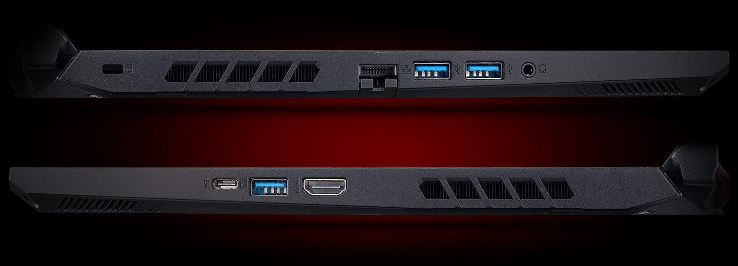 Về các cổng kết nối thì Acer nitro an515 cũng không có gì thay đổi, vẫn được trang bị đầy đủ các cổng kết nối quen thuộc như HDMI, 1 cổng USB Type-C (ThunderBolt 4 / DisplayPort), 3 cổng USB 3.0, một cổng MicroSD Reader, 1 LAN RJ45, 1 Webcam HD 720p, 1 Jack Audio™ 3.5mm, 1 Jack Power, cổng mạng, tai nghe,... được phân bổ đều ra 2 cạnh bên trái phải của máy, riêng cổng sạc thì nằm ở mặt sau, 1 trong 3 cổng Usb sẽ có hỗ trợ sạc các thiết bị bên ngoài ngay cả khi máy bạn đã tắt, các cổng kết nối giúp máy vừa truyền tải dữ liệu tốc độ cao, vừa có chức năng sạc nhanh 5V 3A, nhưng cổng HDMI và usb type c có vị trí gây đôi chút vướng víu khi sử dụng cùng lúc cắm ổ cứng rời, chuột rời, cắm màn hình ngoài.