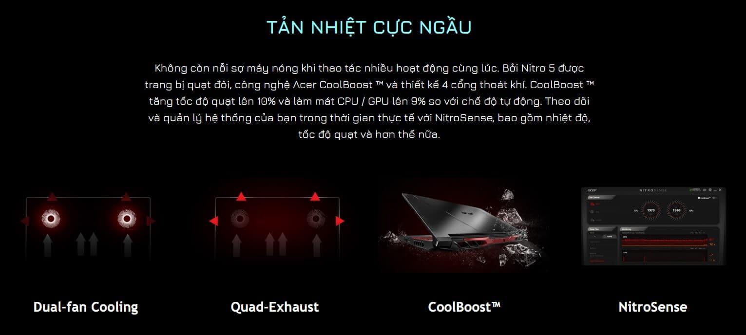 Hệ thống tản nhiệt Acer Nitro 5 R9JM trang bị công nghệ quạt kép 2 quạt kích thước lớn, cùng 3 ống đồng tản nhiệt, được sơn cách nhiệt cùng nhiều khe thoát gió hứa hẹn mang lại khả năng tản nhiệt cực kỳ tốt. Công nghệ CoolBoost giúp tăng quạt lên 10% với khả năng làm mát có thể tùy chỉnh nhanh chóng 3 chế độ quạt bằng Nitro Sense. Với trải nghiệm thực tế phòng máy lạnh 27 độ C, chơi game liên tục 2 tiếng thì nhiệt độ CPU cao nhất chỉ khoảng 80 độ, GPU cũng khá mát mẻ với nhiệt độ tầm 66 độ C. Nhiệt độ tỏa ra bên ngoài như bàn phím chỗ để tay đều khá mát mẻ, các hốc tản nhiệt có nhiệt độ tầm 40 độ C.