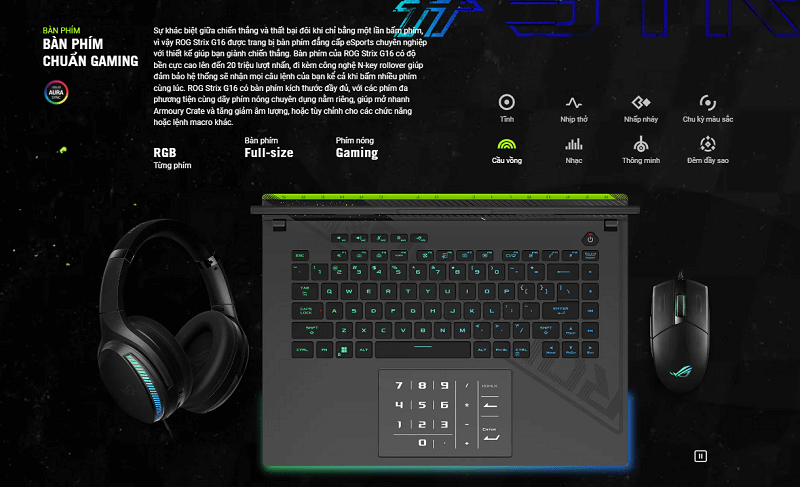 - Bàn phím Chiclet keyboard của Asus ROG Strix G16 được thiết kế nổi bật với hệ thống LED RGB cho phép hiển thị và điều chỉnh màu sắc từng vùng hoặc toàn bộ bàn phím thông qua tính năng Aura Sync. Nó còn tích hợp các phím nóng chuyên dụng cho việc truy cập nhanh vào các lệnh cần thiết như điều chỉnh âm lượng, tắt / bật Micro, mở phần mềm nhanh, cùng khả năng điều chỉnh chế độ quạt gió của hệ thống tản nhiệt. Các phím W, A, S, D được làm nổi bật với màu sắc khác biệt, tạo điểm nhấn và giúp người dùng dễ dàng nhận biết trong quá trình chơi Game.