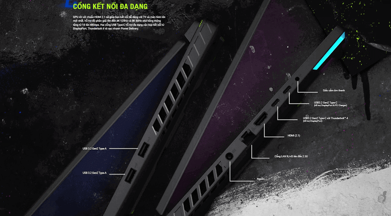 Asus ROG Strix G16 G614 được trang bị đầy đủ các cổng I/O linh hoạt và hiện đại nhất, đáp ứng đầy đủ nhu cầu của người dùng: