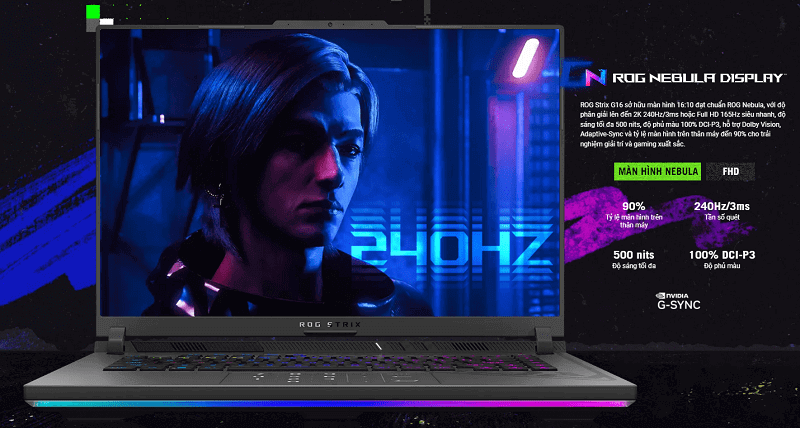 - Asus ROG Strix G16 mang đến trải nghiệm hình ảnh xuất sắc và giàu chi tiết với màn hình 16.0-inch với độ phân giải QHD+ (2560*1600) pixel và tần số quét 240Hz Nebula (tuỳ phiên bản). Sự cân bằng khéo léo giữa tốc độ làm mới và độ phân giải, màn hình này đảm bảo một trải nghiệm hình ảnh tuyệt vời với viền siêu mỏng tạo không gian trải nghiệm rộng hơn, vượt trội hơn so với những dòng laptop trước đây cùng kích thước.