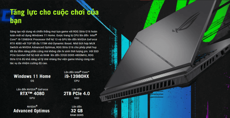Thiết kế mới mẻ và hệ thống tản nhiệt phiên bản 3 quạt làm mát, màn hình 16-inch với tỉ lệ 16:10 và độ phân giải QHD+, cùng với CPU Intel HX Gen 13th và GPU Nvidia GeForce RTX 40 Series cùng với công nghệ MUX switch tạo đem đến hiệu năng vô cùng khủng cho người dùng. Đó là đôi nét về dòng laptop gaming Asus ROX Strix G16, nếu bạn đã cảm thấy phấn khích với dòng sản phẩm này thì ngay bây giờ, hãy cùng LAPTOPNEW khám phá em nó trong bài viết dưới đây nhé!