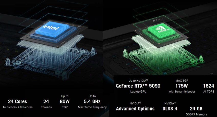 - Nhờ trang bị bộ vi xử lý CPU Intel Ultra AI thế hệ mới nhất (series 2) xung nhịp tối đa có thể lên tới 5.4GHz, SCAR 16 G635 có thể xử lý mượt mà nhiều các tác vụ đa nhiệm cùng lúc. Dù là game AAA, dựng phim hay các phần mềm đồ họa chuyên sâu, CPU của sản phẩm luôn đảm bảo hiệu năng “Desktop-level” trên một thiết bị Laptop di động.