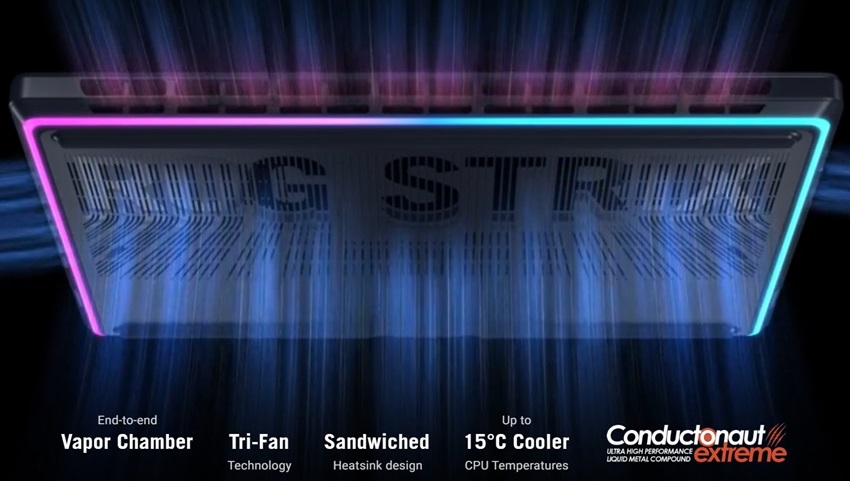 - Không khí được hút vào từ hai bên và đáy máy, kết hợp cùng thiết kế luồng gió xuyên qua bàn phím, giúp giữ cho lòng bàn tay luôn mát mẻ ngay cả trong những trận đấu căng thẳng. Đặc biệt, Strix SCAR 16 (2025) sử dụng hệ thống tản nhiệt buồng hơi (Vapor Chamber) kết hợp bộ tản nhiệt kẹp, đi cùng với 3 quạt Công nghệ Tri-Fan và kim loại lỏng Conductonaut Extreme trên cả CPU lẫn GPU.
