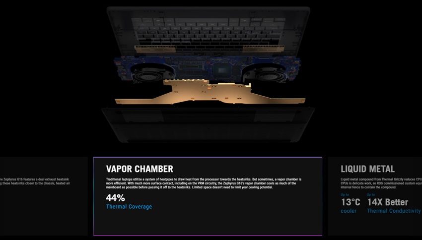 - Một trong những điểm mạnh nổi bật của Asus ROG Zephyrus chính là hệ thống tản nhiệt tiên tiến, đảm bảo chiếc laptop luôn mát mẻ và êm ái trong mọi tình huống sử dụng. Công nghệ tản nhiệt ROG Intelligent Cooling được tích hợp sâu sắc trong cấu trúc của máy, mang lại sự cân bằng hoàn hảo giữa khả năng tản nhiệt mạnh mẽ và tiếng ồn cực kỳ thấp. Zephyrus G16 được trang bị công nghệ 3 quạt tản nhiệt kết hợp với tản nhiệt buồng hơi hoàn toàn mới. Hệ thống này không chỉ giúp hấp thu và loại bỏ nhiệt lượng hiệu quả từ CPU, GPU, VRAM và các mạch VRM mà còn bao phủ tới 44% diện tích bo mạch chủ. Nhờ đó, nhiệt lượng được dẫn ra ngoài nhanh chóng, giúp duy trì hiệu suất tối đa của các linh kiện mà không bị “om nhiệt”.