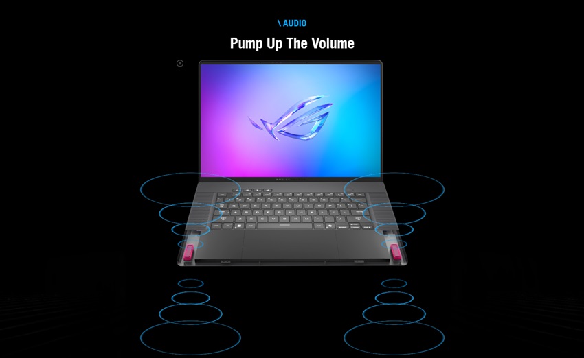 - Zephyrus G16 2025 mang đến trải nghiệm âm thanh ấn tượng dù là một chiếc máy 16 inch siêu mỏng. Với hệ thống 6 loa, bao gồm loa trầm Dual Force, sản phẩm đạt được mức âm lượng tăng lên tới 47% so với các dòng laptop cùng phân khúc. Tần số âm trầm siêu thấp 100Hz giúp tái hiện âm thanh một cách chi tiết và sống động, cho bạn cảm nhận được từng nốt trầm sâu lắng. Công nghệ Dolby Atmos được tích hợp mang đến trải nghiệm âm thanh vòm 5.1.2 đầy đặn, với hiệu ứng âm thanh xếp lớp và nhiều sắc thái phong phú, giúp bạn chìm đắm hoàn toàn vào không gian phim ảnh hay các tựa game. Dù bạn đang nghe podcast yêu thích hay tham gia trận đấu game căng thẳng, Zephyrus G16 đều sẵn sàng nâng tầm trải nghiệm âm thanh của bạn.