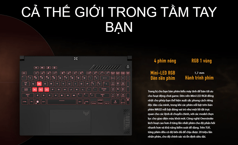 - Laptop gaming này ra đời với mục tiêu trở thành một con ngựa chiến mạnh mẽ. Không chỉ đáp ứng nhu cầu chơi các tựa Game nặng như AAA mà còn đảm bảo sự bền bỉ và ổn định để bạn có thể sử dụng trong thời gian dài với cường độ cao. Điều này đến từ tính bền đặc trưng của dòng sản phẩm TUF, đã được kiểm chứng bởi tiêu chuẩn quân sự. Bạn có thể tự tin bỏ máy vào balo và mang theo mọi nơi mà không phải lo lắng về sự an toàn của nó, ngay cả trong điều kiện vận động nhiều.