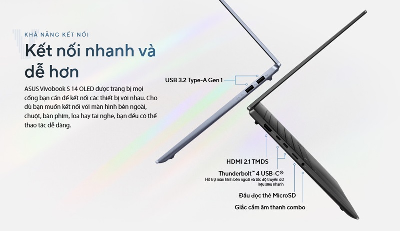 - Lượng cổng kết nối của Asus Vivobook S 14 OLED khá đầy đủ, cho khả năng kết nối với các thiết bị ngoại vi với tốc độ cao.