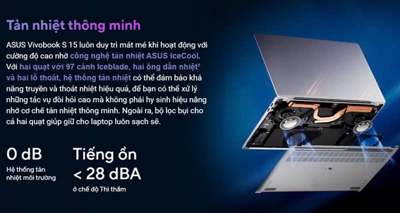 - ASUS Vivobook S5507 được áp dụng công nghệ tản nhiệt IceCool với hệ thống 2 quạt 97 cánh IceBlade và 2 ống đồng dẫn nhiệt hiệu quả.