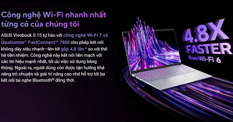 - Phần cổng kết nối LAN được cắt bớt nhưng thay vào đó chính là công nghệ Wi-Fi 7 và Qualcomm® FastConnect™ 7800 sẽ tăng tốc độ kết nối internet của thiết bị lên gấp 4.8 lần so với thế hệ trước.