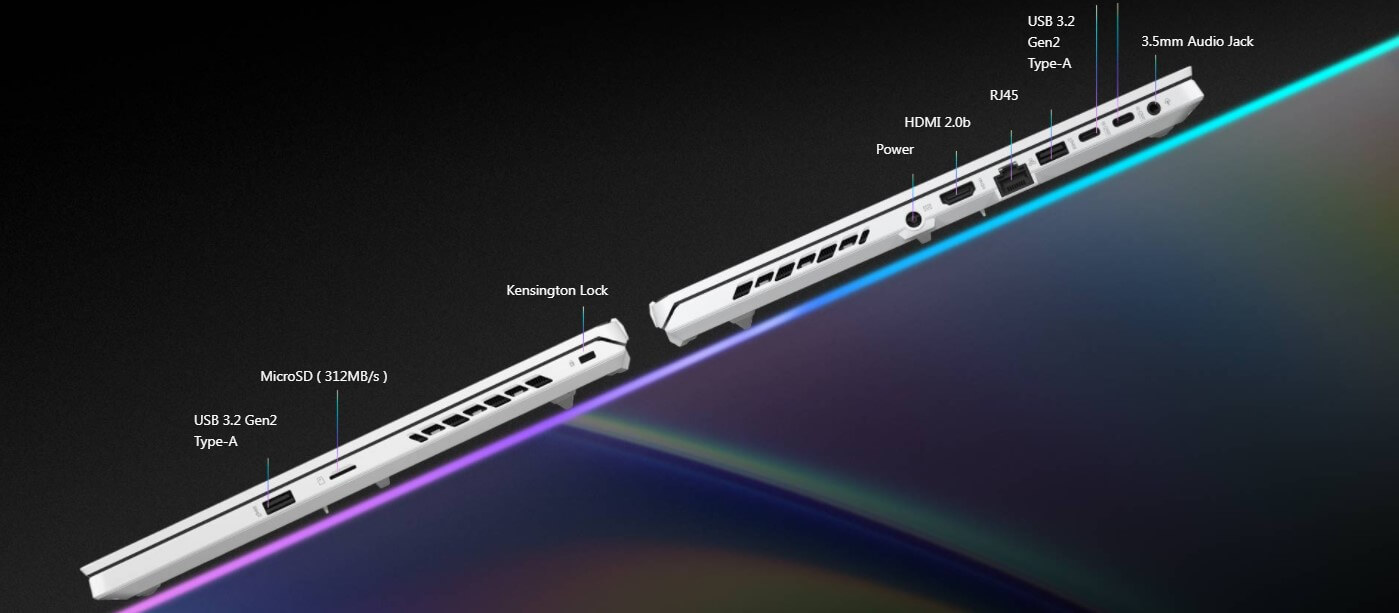 Tương tự như các phiên bản gaming khác, zephyrus g15 ga503 được trang bị đầy đủ các cổng kết nối với chủng loại đa dạng, để đảm bảo mọi kết nối phục vụ cho người dùng trải nghiệm tất cả các loại game, phục vụ công việc, livestream, học tập một cách dễ dàng. Hai bên thân máy được trang bị 1 cổng nguồn, khe thẻ HDMI, 3 cổng Usb 3.1, 1 cổng Usb TypeC, 1 DisplayPort, 1 Lan Rj45, 1 cổng microSD card reader, Smart AMPart AMP Audio™, AC Power adapter jack.