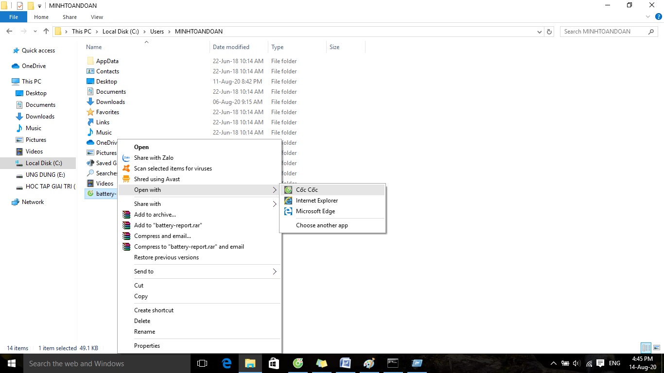 Bước 4: Mở file battery-report.html bằng trình duyệt bằng cách nhấp chuột phải vào file Battery-report.html di chuột đến Open with chọn trình duyệt Cốc Cốc