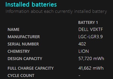 Bước 5: Sau khi mở file bằng trình duyệt, bạn sẽ thấy mọi thông tin về Pin sẽ hiển thị trong đây (hình minh họa). Bạn để ý đến phần Installed batteries, nhìn vào 2 dòng Design Capacity và Full Charge Capacity.