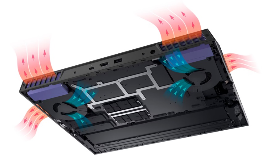 - Cấu trúc tản nhiệt bao gồm bốn khe thoát khí được bố trí hợp lý ở phía sau và hai bên hông máy. Các cánh quạt sử dụng công nghệ Blade Ultra-Thin, có khả năng tạo ra luồng gió lớn trong khi vẫn giữ mức tiếng ồn ở mức chấp nhận được. Toàn bộ hệ thống dẫn nhiệt sử dụng ống đồng cỡ lớn, kết hợp cùng các miếng tản nhiệt trải đều trên bề mặt linh kiện giúp truyền nhiệt nhanh và hiệu quả hơn.