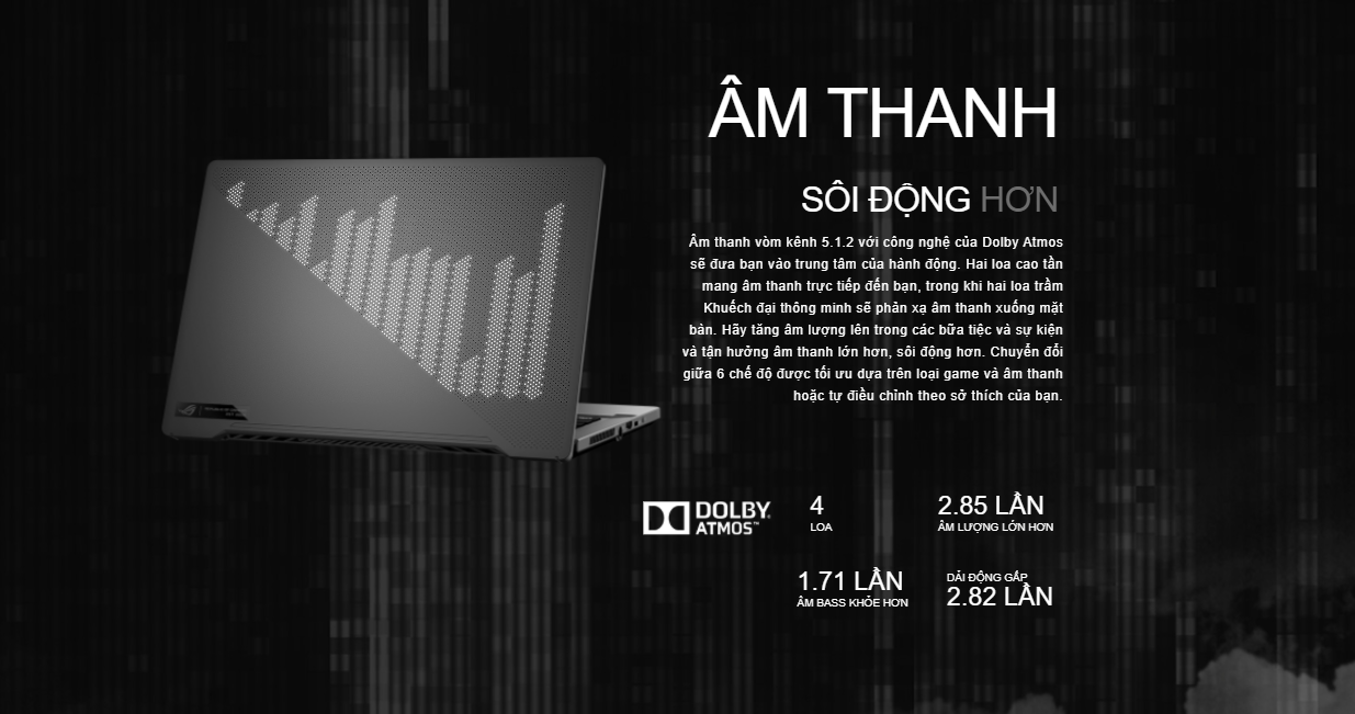 Âm thanh vòm kênh 5.1.2 với công nghệ của Dolby Atmos sẽ đưa bạn vào trung tâm của hành động. Hai loa cao tần mang âm thanh trực tiếp đến bạn, trong khi hai loa trầm Khuếch đại thông minh sẽ phản xạ âm thanh xuống mặt bàn. Hãy tăng âm lượng ROG ZEPHYRUS G14 GA401IU lên trong các bữa tiệc và sự kiện và tận hưởng âm thanh lớn hơn, sôi động hơn. Chuyển đổi giữa 6 chế độ được tối ưu dựa trên loại game và âm thanh hoặc tự điều chỉnh theo sở thích của bạn.