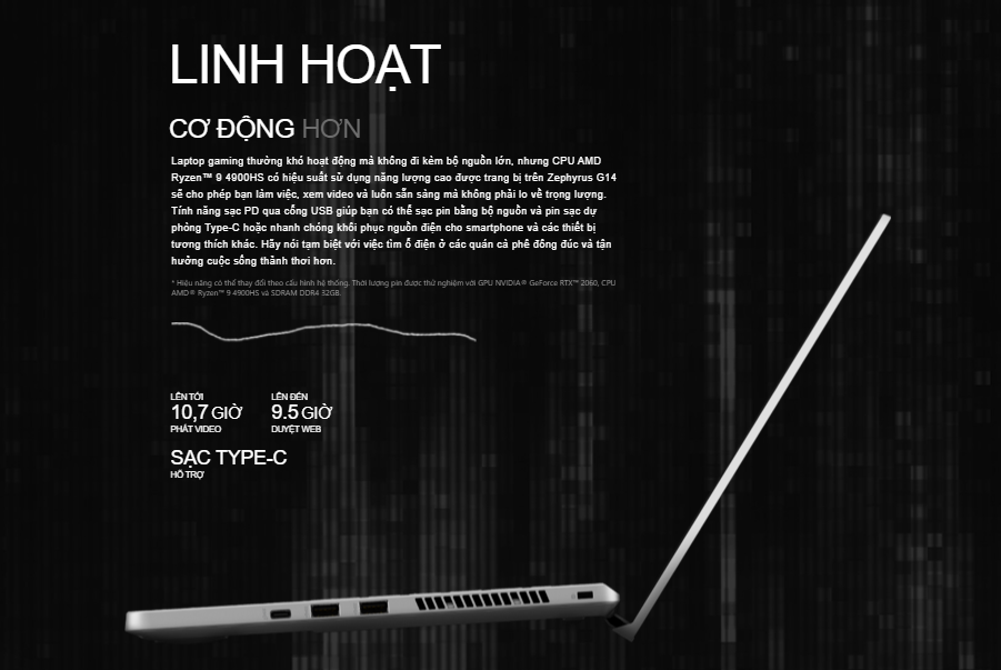 - Laptop gaming thường khó hoạt động mà không đi kèm bộ nguồn lớn, nhưng CPU AMD Ryzen™ 9 4900HS có hiệu suất sử dụng năng lượng cao được trang bị trên Zephyrus G14 sẽ cho phép bạn làm việc, xem video và luôn sẵn sàng mà không phải lo về trọng lượng. Tính năng sạc PD qua cổng USB giúp bạn có thể sạc pin bằng bộ nguồn và pin sạc dự phòng Type-C hoặc nhanh chóng khôi phục nguồn điện cho smartphone và các thiết bị tương thích khác. Hãy nói tạm biệt với việc tìm ổ điện ở các quán cà phê đông đúc và tận hưởng cuộc sống thảnh thơi hơn.