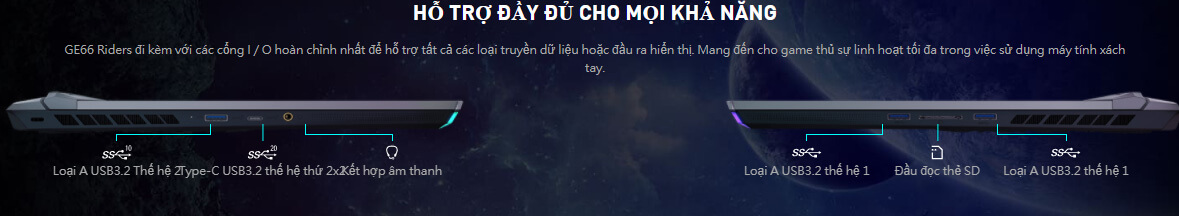 - MSI GE66 11UG có cho mình tất cả cổng kết nối hiện đại và hợp thời nhất như: 1 x HDMI, 1 x Mini Display Port, 1 x USB Type-C, 2 x USB 3.1, 1 x Mystic Light RGB, 1 x Jack Audio™, 1 x MicroSD Reader, 1 x Killer LAN RJ45 Gigabit, 1 x Webcam FHD, 1 x Hi-Res Audio™ with Nahimic 3 Audio™, 1 x Duo Wave Speaker by Dynaudio with 2 speaker, 1 x Steelseries Engine 3, 1 x CoolerBoost 5 (2 Fans with 7 heat pipes), 1 x True Color.