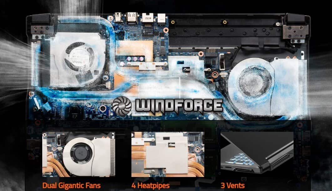 Laptop gigabyte g5 này được trang bị hệ thống làm mát WINDFORCE mới nhất, hiệu suất làm mát tổng thể của hệ thống này lên đến 150W, không chỉ giúp đạt được 100% hiệu năng CPU và GPU mà nó còn khá ổn định trong điều kiện khắc nghiệt. Mang lại trải nghiệm tốt và tốc độ nhanh hơn khi chơi game hay sử dụng phần mềm đồ họa cao. Quạt kép khổng lồ.