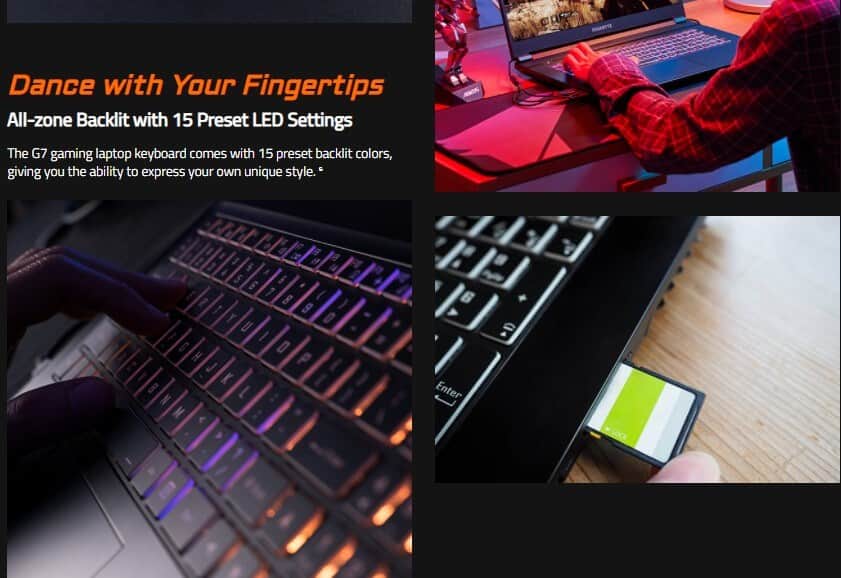 - GIGABYTE G7 với kích thước màn hình khủng 17.3 inch, cùng CPU Intel Core i7 dòng H thế hệ 11 có 8 nhân 16 luồng đạt xung nhịp 4.6GHz  xử lí nhanh, ổn định, cấu hình mạnh mẽ và thiết kế tinh tế chắc chắn, kết hợp cùng với hệ thống tản nhiệt khủng giúp máy luôn mát mẻ khi sử dụng chơi game hoặc làm việc công suất cao, thì chắc chắn khi chọn chiếc laptop gaming này sẽ không làm những bạn game thủ thất vọng.