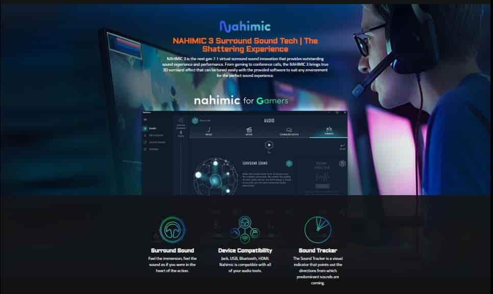 - NAHIMIC 3 là cải tiến âm thanh vòm ảo thế hệ 7.1 tiếp theo mang đến trải nghiệm và hiệu suất âm thanh vượt trội. Từ chơi game đến các cuộc gọi hội nghị, NAHIMIC 3 mang đến hiệu ứng vòm 3D thực sự có thể được điều chỉnh dễ dàng bằng phần mềm được cung cấp để phù hợp với mọi môi trường để có trải nghiệm âm thanh hoàn hảo.