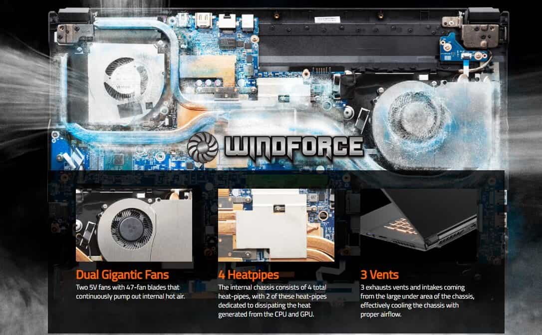 - Hệ thống tản nhiệt  gigabyte g7 gaming không có gì thay đổi so với G5 cũng được trang bị quạt kép khổng lồ với hệ thống hai quạt 5V với 47 cánh quạt và 53 cánh quạt liên tục để bơm khí nóng bên trong ra ngoài. Kết hợp cùng khung bên trong bao gồm tổng cộng 4 ống dẫn nhiệt, với 2 trong số các ống dẫn nhiệt này được thiết kế dành riêng để tản nhiệt tạo ra từ CPU và GPU kết hợp cùng 3 lỗ thông hơi 3 lỗ thoát khí và cửa hút đến từ diện tích lớn bên dưới của khung, làm mát hiệu quả khung với luồng không khí thích hợp.