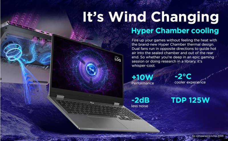 - Hoạt động tản nhiệt của 2 quạt của Lenovo LOQ cũng được đặt theo hướng ngược nhau, khoảng cách giữa quạt và khe thoát nhiệt lớn, tránh khí nóng đi ngược vào máy và tránh được hiện tượng tăng nhiệt khi laptop hoạt động trong môi trường có nhiệt độ không quá dễ chịu, hiệu quả làm mát cũng cao hơn thế hệ trước đó khoảng 2°C. Nhờ vào khả năng tản nhiệt vượt trội này mà hiệu năng phần cứng luôn được đảm bảo khi thực hiện các tác vụ đồ hoạ cao, cũng như tuổi thọ của CPU, VGA cũng được kéo dài.