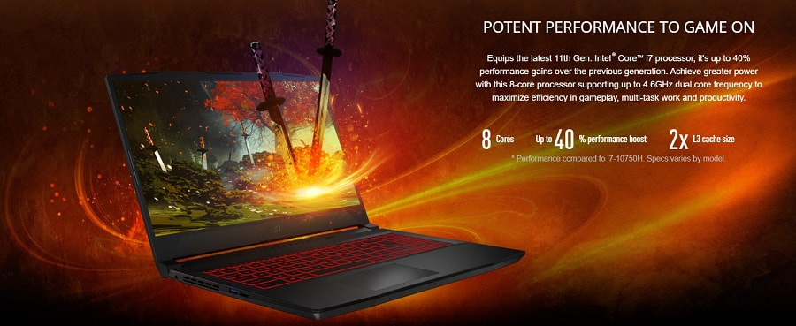 - Chip xử lý Intel® i7-11800H Gen 11th mạnh mẽ, Ran 8GB DDR4, SSD 512GB PCIe, Card đồ hoạ VGA RTX 3050 4GB.