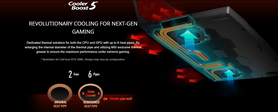 Điểm đặc biệt nhất của laptop msi katana gf76 chính là công nghệ tản nhiệt chuyên dụng dành riêng cho cả CPU và GPU với tối đa 6 ống dẫn nhiệt hoạt động cùng lúc. MSI đã mở rộng đường kính bên trong ống và sử dụng mỡ tản nhiệt độc quyền để đảm bảo bạn có thể chơi các tựa game nặng bằng hiệu suất tốt đa một cách tốt nhất.