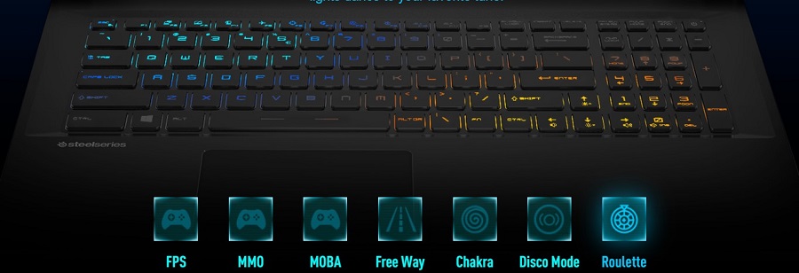 - Bàn phím fullsize đến từ Steelseries, hành trình phím sâu mang lại trải nghiệm game cực đã cho các game thủ. Có đèn led RGB ẩn dưới bàn phím dường như là 1 điều không thể thiếu với các dòng laptop MSI. Với