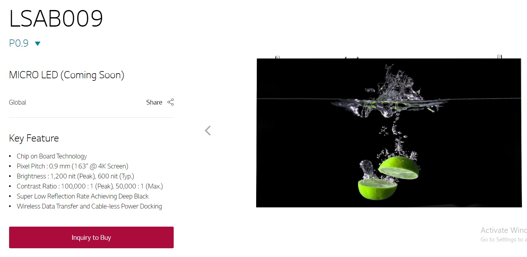 LG Display vốn nổi tiếng là một trong những nhà sản xuất màn hình hàng đầu thế giới. Thời gian gần đây, công ty chỉ xuất xưởng được 3,6 triệu đơn vị OLED cỡ lớn do ảnh hưởng bởi đại dịch. Tuy nhiên, bất chấp tình hình hiện tại, công ty vẫn âm thầm ra mắt thêm sản phẩm mới LSAB009, một chiếc TV micro-LED 4K 163-inch, trên website "Giải pháp kinh doanh" của mình.