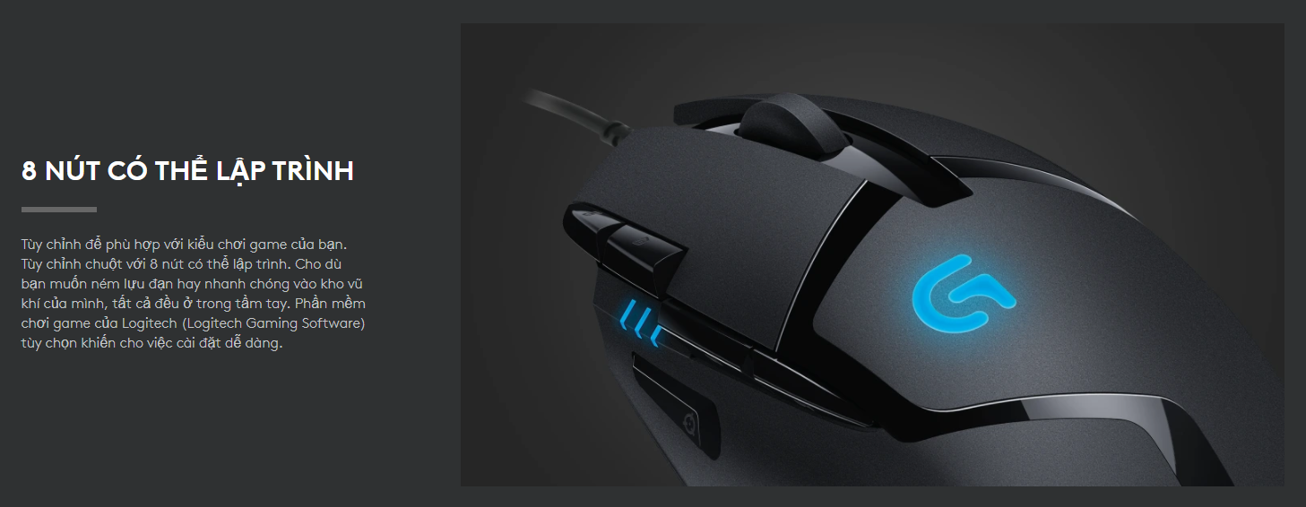 Tùy chỉnh để phù hợp với kiểu chơi game của bạn. Tùy chỉnh chuột với 8 nút có thể lập trình. Cho dù bạn muốn ném lựu đạn hay nhanh chóng vào kho vũ khí của mình, tất cả đều ở trong tầm tay. Phần mềm chơi game của Logitech (Logitech Gaming Software) tùy chọn khiến cho việc cài đặt dễ dàng.