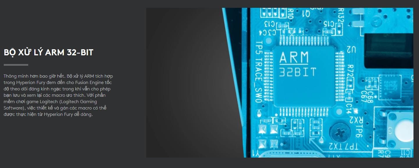 Thông minh hơn bao giờ hết. Bộ xử lý ARM tích hợp trong Hyperion Fury đem đến cho Fusion Engine tốc độ theo dõi đáng kinh ngạc trong khi vẫn cho phép bạn lưu và xem lại các macro ưa thích. Với phần mềm chơi game Logitech (Logitech Gaming Software), việc thiết kế và gán các macro có thể được thực hiện từ Hyperion Fury dễ dàng.