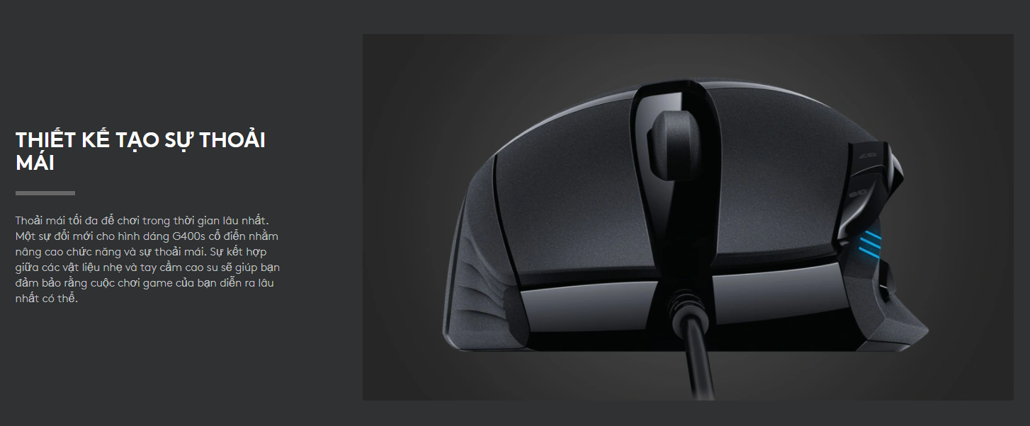 Thoải mái tối đa để chơi trong thời gian lâu nhất. Một sự đổi mới cho hình dáng G400s cổ điển nhằm nâng cao chức năng và sự thoải mái. Sự kết hợp giữa các vật liệu nhẹ và tay cầm cao su sẽ giúp bạn đảm bảo rằng cuộc chơi game của bạn diễn ra lâu nhất có thể.