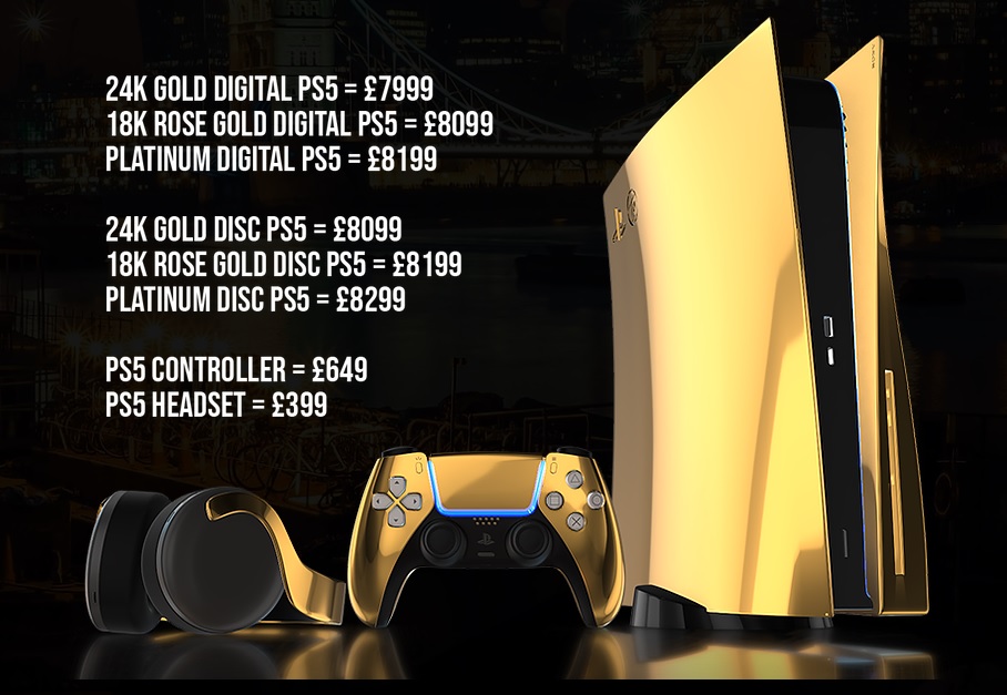 Nếu cảm thấy việc bỏ ra từ 7.999 đến 8.299 bảng Anh cho một chiếc PlayStation 5 mạ vàng hoặc bạch kim; hoặc 399 bảng Anh cho một chiếc tai nghe PS5 có vẻ không hấp dẫn, bạn có thể chọn một chiếc iPad Pro mạ vàng có giá từ... 2.200 bảng Anh (chưa bao gồm VAT) cùng nhiều sản phẩm đắt đỏ tương tự khác trên trang chủ.