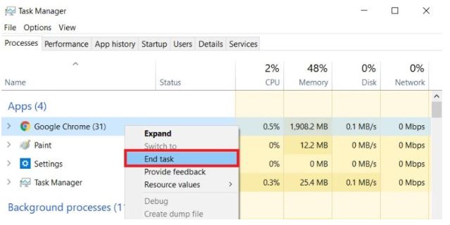 ✓ Nếu bạn nào chưa biết cách ép tắt ứng dụng thông qua Task Manager thì các bạn chỉ cần click chuột phải vào ứng dụng rồi End task là xong. Tuy nhiên, bên cạnh việc giúp ứng dụng thoát đơ bằng cách ép tắt thì nó cũng sẽ khiến cho các dữ liệu chưa save của bạn bị mất. Nhưng nghĩ lại thì một khi ứng dụng đã bị lỗi, các dữ liệu chưa save của bạn cũng không khôi phục được.