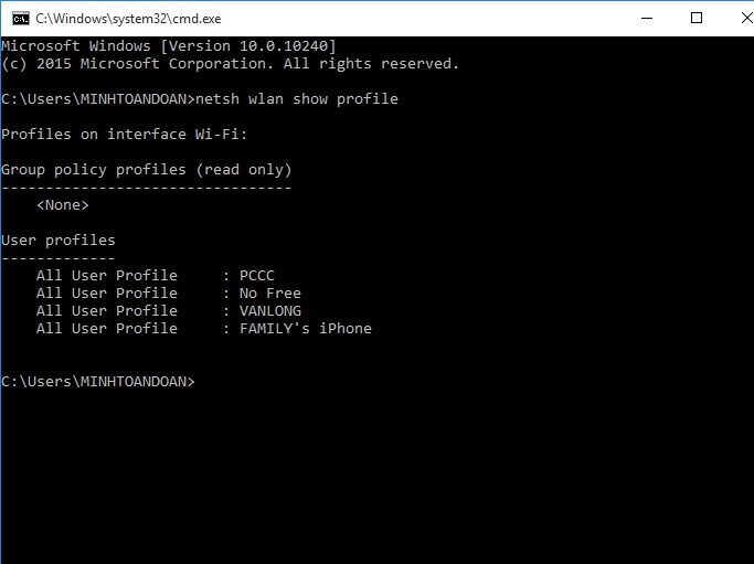 Bước 1: Vào Start, gõ Run nhấn Enter, xuất hiện hộp thoại Run, gõ cmd nhấn Enter. Sau khi cửa sổ cmd xuất hiện bạn hãy sử dụng lệnh sau: netsh wlan show profile nhấn Enter, để xem tên của mạng wifi mà bạn đã từng kết nối. Nó sẽ hiện ra một danh sách tất cả các mạng mà bạn đã từng tham gia vào.