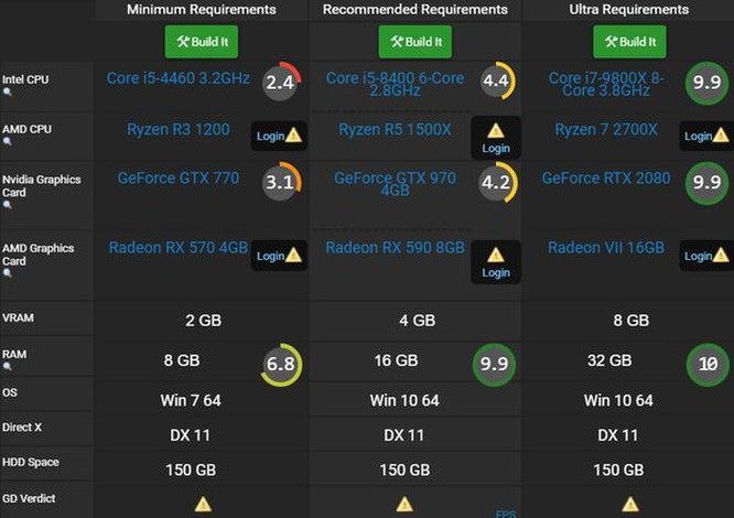 Người dùng chỉ cần dàn máy cấu hình tối thiểu gồm CPU AMD Ryzen 3 1200 hoặc Intel Core i5-4460, GPU AMD Radeon RX 570 hoặc Nvidia GTX 700 (VRAM 2 GB), RAM 8 GB, ổ cứng 150 GB để chơi. Ngoài ra, cần có Internet tốc độ 5 Mbps trở lên. Game cũng có tùy chọn không cần kết nối Internet nhưng không được khuyên dùng.