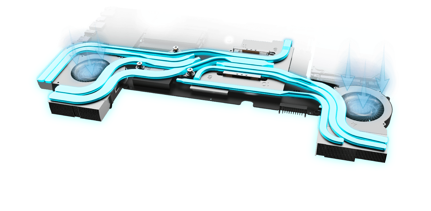 Các giải pháp tản nhiệt chuyên dụng cho cả CPU và GPU với tổng cộng 7 ống dẫn nhiệt đảm bảo hiệu suất tối đa khi chơi game.