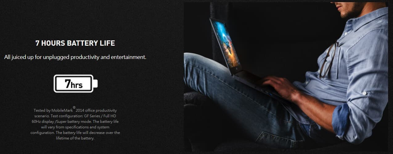 Thời lượng pin của MSI GF63 10SC lên đến 7hrs SreenSaver nhờ vào pin 51WHrs Li-ion Battery, người dùng có thể sử dụng máy cho công việc và giải trí trong khoảng thời gian dài mà không cần phích cắm. Thường có quan điểm rằng, máy càng dày thì thời lượng pin càng lâu, nhưng với GF63 có thời lượng pin tương đối cao nhưng trọng lượng không hề lớn và chỉ nặng 1.86kg.