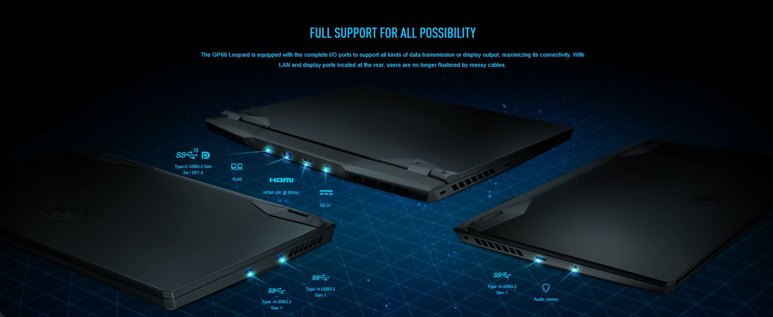 - MSI GP66 được trang bị các cổng I / O hoàn chỉnh để hỗ trợ tất cả các loại truyền dữ liệu hoặc đầu ra hiển thị, tối đa hóa khả năng kết nối của nó. Với mạng LAN và các cổng hiển thị được đặt ở phía sau, người dùng không còn bối rối bởi những sợi dây cáp lộn xộn. Nó có cho mình tất cả cổng kết nối hiện đại và hợp thời nhất như: 1 x HDMI, 1 x Mini Display Port, 1 x USB Type-C, 2 x USB 3.1, 1 x Jack Audio™, 1 x MicroSD Reader, 1 x LAN RJ45 Gigabit, 1 x Webcam, 1 x Hi-Res Audio™ with Nahimic 3 Audio™, 1 x Giant Speaker with 2 Speaker, 1 x Steelseries Engine 3, 1 x CoolerBoost 5 (2 Fans with 7 heat pipes).