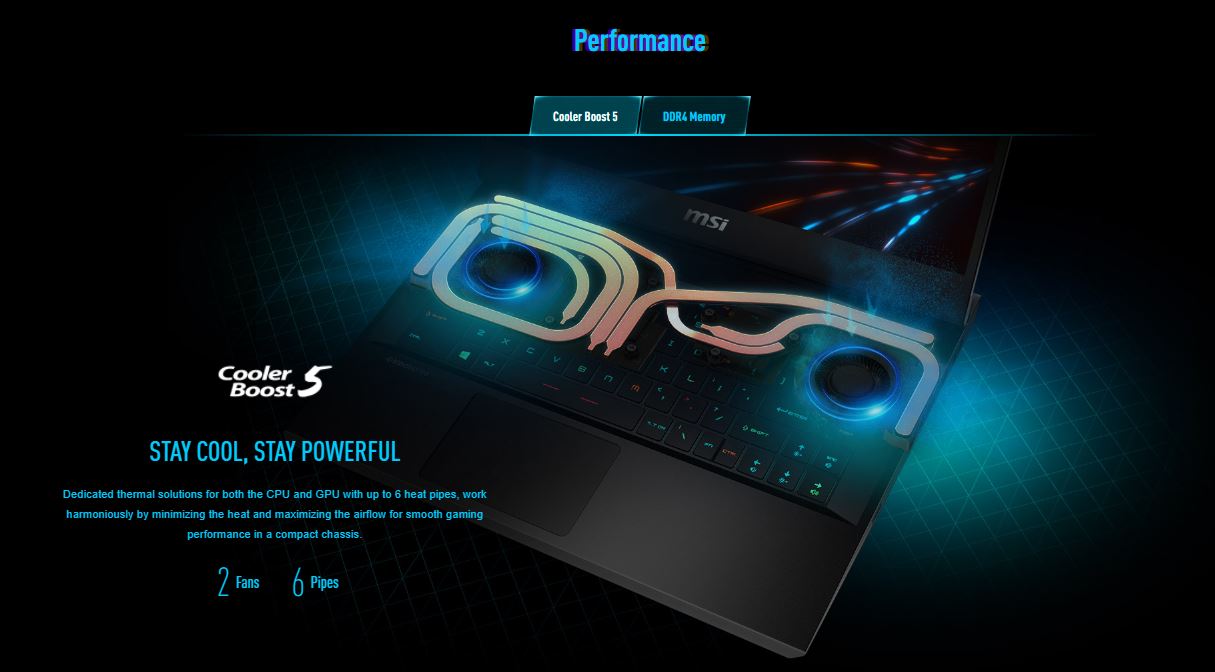 MSI GP66 trang bị các giải pháp tản nhiệt chuyên dụng cho cả CPU và GPU với tối đa 6 ống dẫn nhiệt, hoạt động hài hòa bằng cách giảm thiểu nhiệt và tối đa hóa luồng không khí để mang lại hiệu suất chơi game mượt mà trong một khung máy nhỏ gọn.