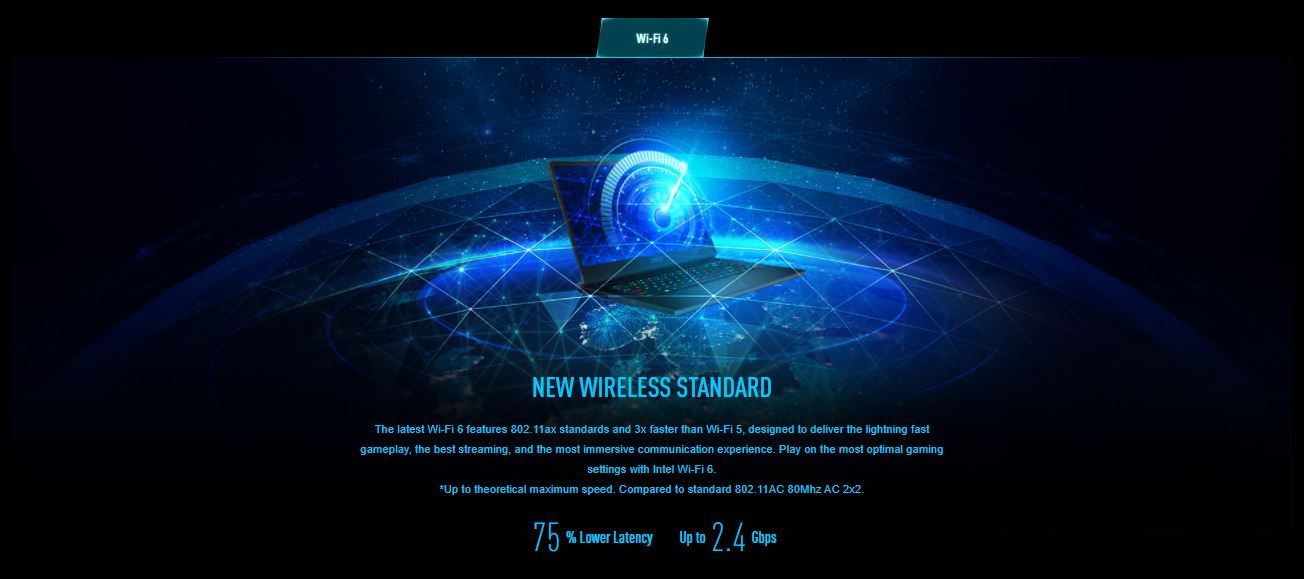 - GP66 10UE sử dụng Wi-Fi 6 mới nhất có tiêu chuẩn 802.11ax và nhanh hơn gấp 3 lần so với Wi-Fi 5, được thiết kế để mang đến trải nghiệm chơi game nhanh như chớp, phát trực tuyến tốt nhất và trải nghiệm giao tiếp sống động nhất. Chơi trên các cài đặt chơi game tối ưu nhất với Intel Wi-Fi 6.