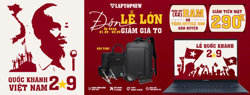 Chào mừng 79 năm ngày Quốc Khánh khai sinh nước Việt Nam. Hoà chung niềm vui cả nước, LAPTOPNEW hân hạnh giới thiệu chương trình ưu đãi và mua sắm dịp lễ 2/9 "ĐÓN LỄ LỚN - GIẢM GIÁ TO" đến quý khách hàng.