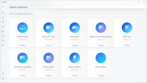 Chỉ bằng một cú nhấp chuột, người dùng có thể chủ động kiểm tra toàn diện máy tính của mình, đảm bảo phần cứng của máy gồm bộ nhớ, WiFi, Bluetooth, HDD và pin đều đang trong tình trạng ổn định. Nếu các cấu phần chưa cập nhật phần mềm, MyASUS tự động tìm kiếm phiên bản mới nhất và cài đặt, hạn chế các trường hợp xung đột phần mềm, ảnh hưởng đến quá trình sử dụng máy.