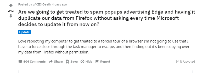 Họ phàn nàn trên diễn đàn Reddit rằng khi dùng công cụ Task Manager để tắt trình (wizard) quảng cáo Edge (thay vì để nó chạy hết quá trình này) thì sẽ phát hiện ra rằng nó đang tự động lấy dữ liệu từ bên Firefox qua, và nhiều người dùng đã phản ánh rằng lịch sử duyệt web của họ đã xuất hiện trong trình duyệt Edge một cách kỳ lạ.
