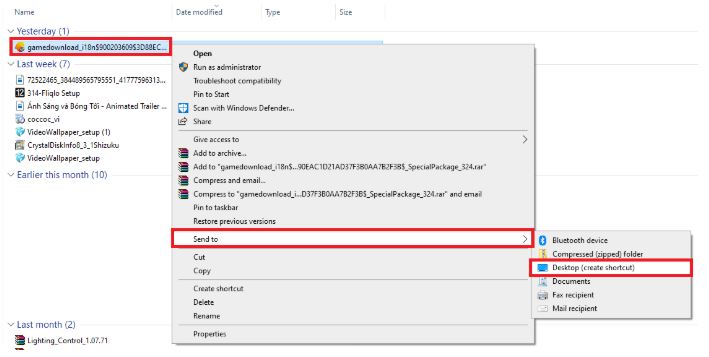 Bước 1: Đầu tiên các bạn cần phải tạo Shortcut cho thư mục cần tạo phím tắt ngoài Desktop. Bạn nhấp chuột phải vào thư mục rồi chọn Send to. Sau đó chọn Desktop (create shortcut).