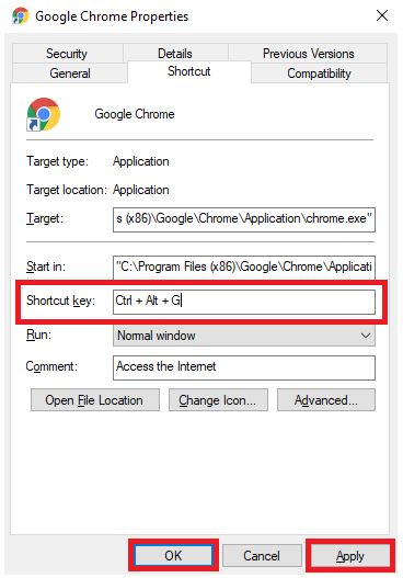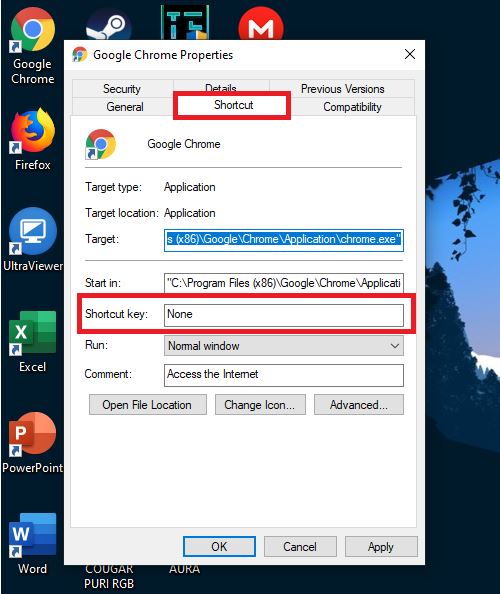 Bước 2: Trong mục Shortcut bạn sẽ thấy dòng Shortcut key. Đây sẽ là phần để bạn đặt phím tắt cho ứng dụng. Tại đây, các bạn có thể sử dụng tổ hợp phím Ctrl + Alt + ký tự chữ cái mà bạn muốn đặt. Có một số trường hợp bạn chỉ cần điền vào ô một ký tự chữ bất kỳ, hệ thống sẽ tự đặt luôn tổ hợp phím Ctrl + Alt cho bạn.