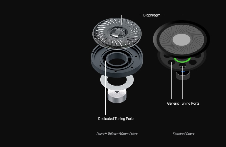 Tai nghe BlackShark V2 của Razer được trang bị Driver TriForce 50mm hoàn toàn mới, được cấp bằng sáng chế, mang tên Razer TriForce Titanium. Có thiết kế đặc biệt với màng loa phủ titan, bên trong là công nghệ TriForce tiên tiến có tính năng tách biệt các tần số âm thanh và cho phép điều chỉnh theo từng dải âm cao, trung, thấp riêng biệt, giúp mang lại âm cao rõ ràng, trung âm đầy đặn, âm trầm mạnh mẽ.