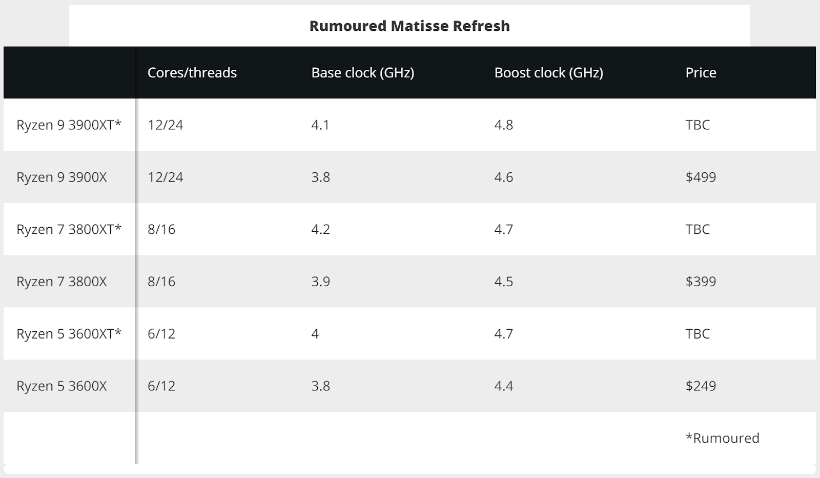 Hiện tại vẫn chưa có thông tin chính thức về những con CPU này, tuy nhiên nếu nó thực sự tồn tại thì đây sẽ là câu trả lời của AMD đối với dòng vi xử lý Intel Core thế hệ 10 “Comet Lake-S” vừa mới ra mắt. Mặc dù những con CPU Intel này khá là ngốn điện vì sử dụng tiến trình 14nm đã 5 năm tuổi, chúng vẫn có chỗ đứng nếu xét về mặt gaming, thậm chí đứng vững là đằng khác. Dự kiến CPU “Matisse Refresh” sẽ được công bố vào ngày 16/06/2020.