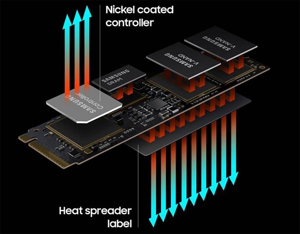 Một trong những điều có tác động quan trọng đến hiệu suất của SSD hiện đại là mức nhiệt của bộ điều khiển. Vì vậy, các ổ đĩa cao cấp dành cho PC chơi game sẽ đi kèm với bộ tản nhiệt, nhưng đây cũng là nguyên nhân khiến SSD này không lắp vừa vào máy tính xách tay. Ổ đĩa 980 PRO của Samsung có bộ điều khiển phủ niken để điều chỉnh mức nhiệt và đảm bảo hiệu suất nhất quán. Hơn nữa, SSD này cũng đi kèm với một nhãn tản nhiệt dựa trên graphene.